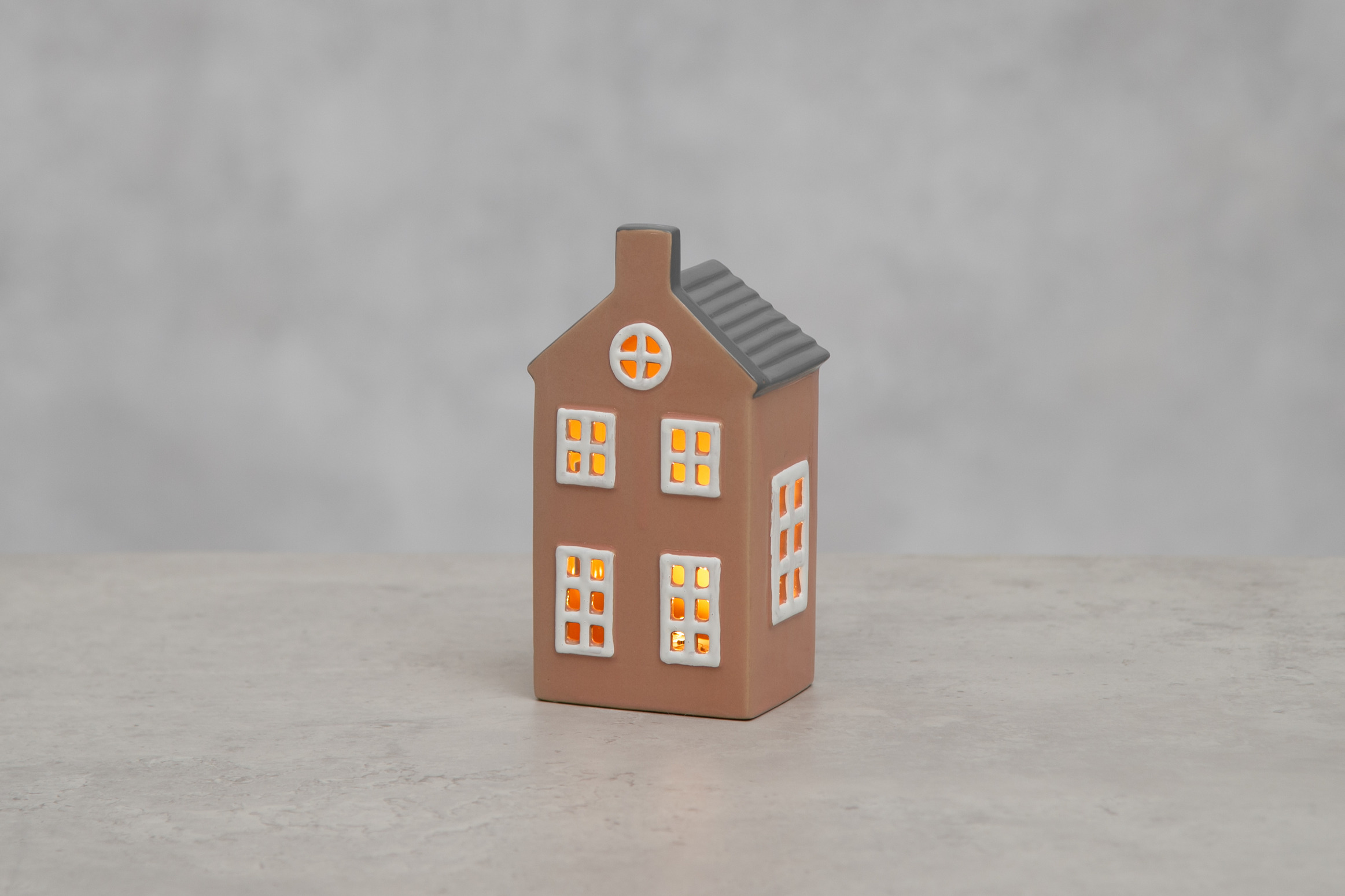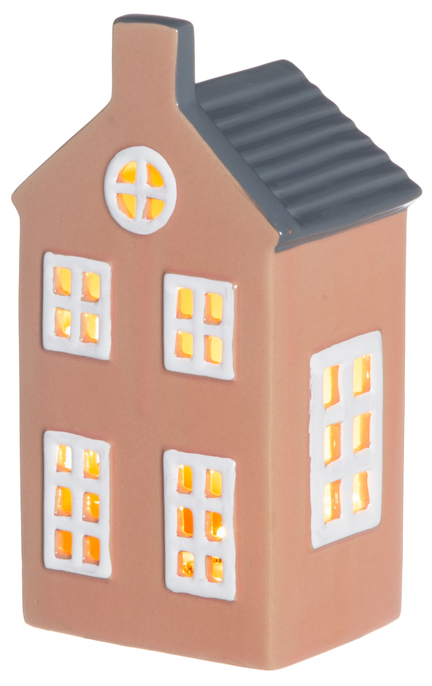Ett stilrent hus i keramik med mjukt tegelrosa ton och kontrasterande grått tak. De vita fönstren lyser upp och ger ett varmt och inbjudande sken när LED-ljuset är tänt. Den klassiska formen gör att lyktan passar lika fint ensam som i en samling av flera huslyktor för att skapa en egen liten stad.