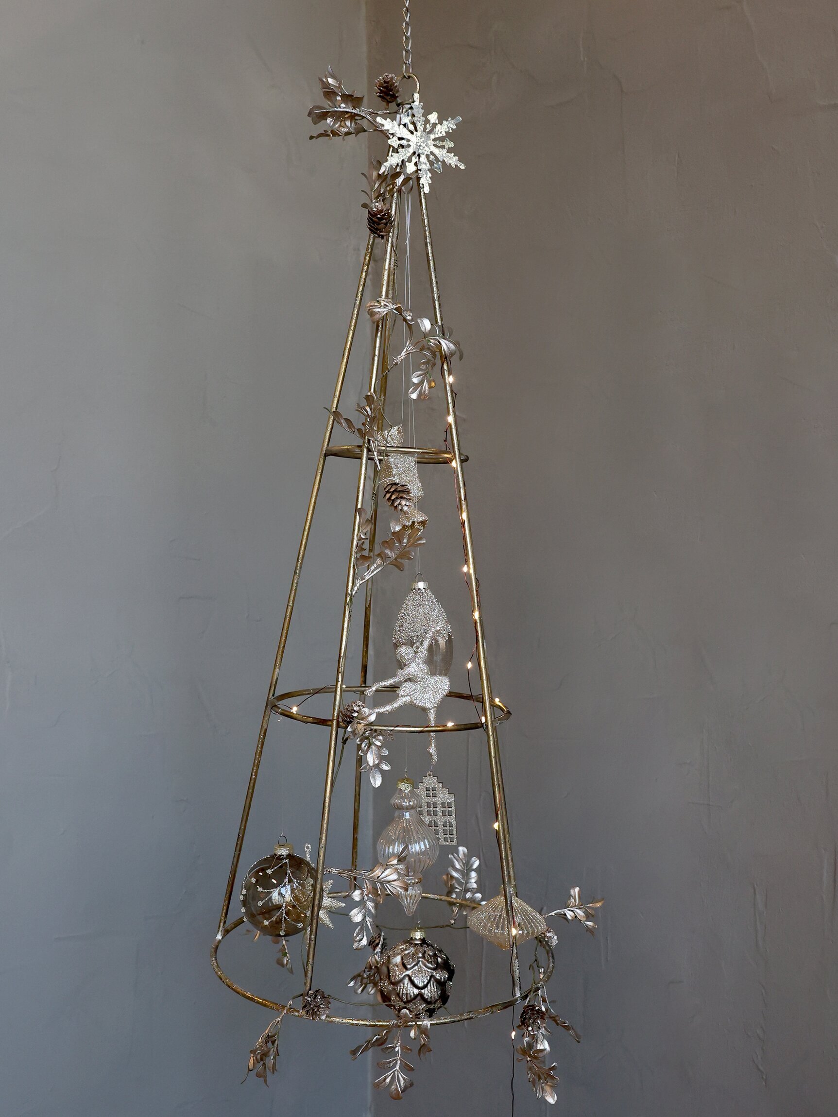 En elegant och stilren hängande gran som blir ett vackert alternativ till den klassiska julgranen. Den öppna metallramen gör det enkelt att dekorera med ljusslingor, kvistar eller julkulor – och resultatet blir ett personligt och stämningsfullt blickfång i hemmet.