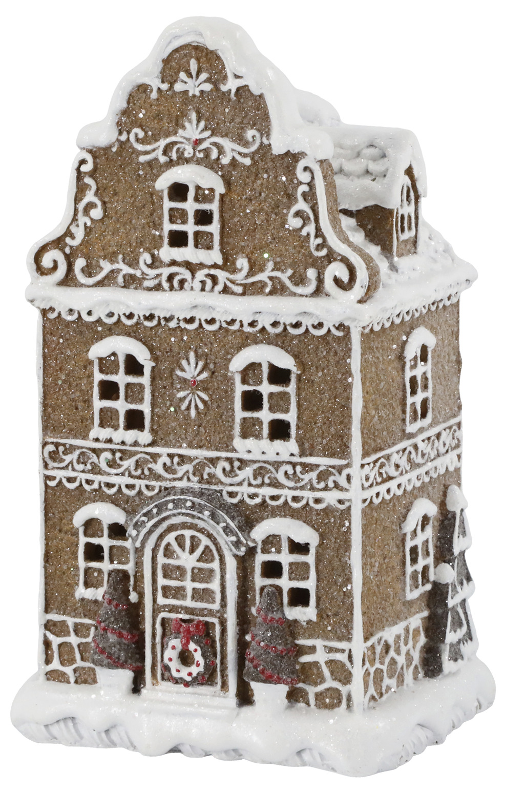 Ett charmigt pepparkakshus i klassisk design med vackra detaljer av snö och dekorativa fönster som sprider ett varmt ljus när det är tänt. Den höga, eleganta fasaden gör huset till en ståtlig detalj i juldekorationerna och det passar lika bra på en hylla som på ett sideboard eller i en julby.