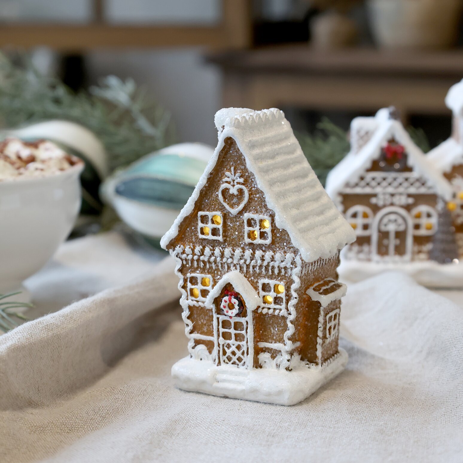 Ett charmigt pepparkakshus i klassisk design med vackra detaljer av snö och dekorativa fönster som sprider ett varmt ljus när det är tänt. Läs mer