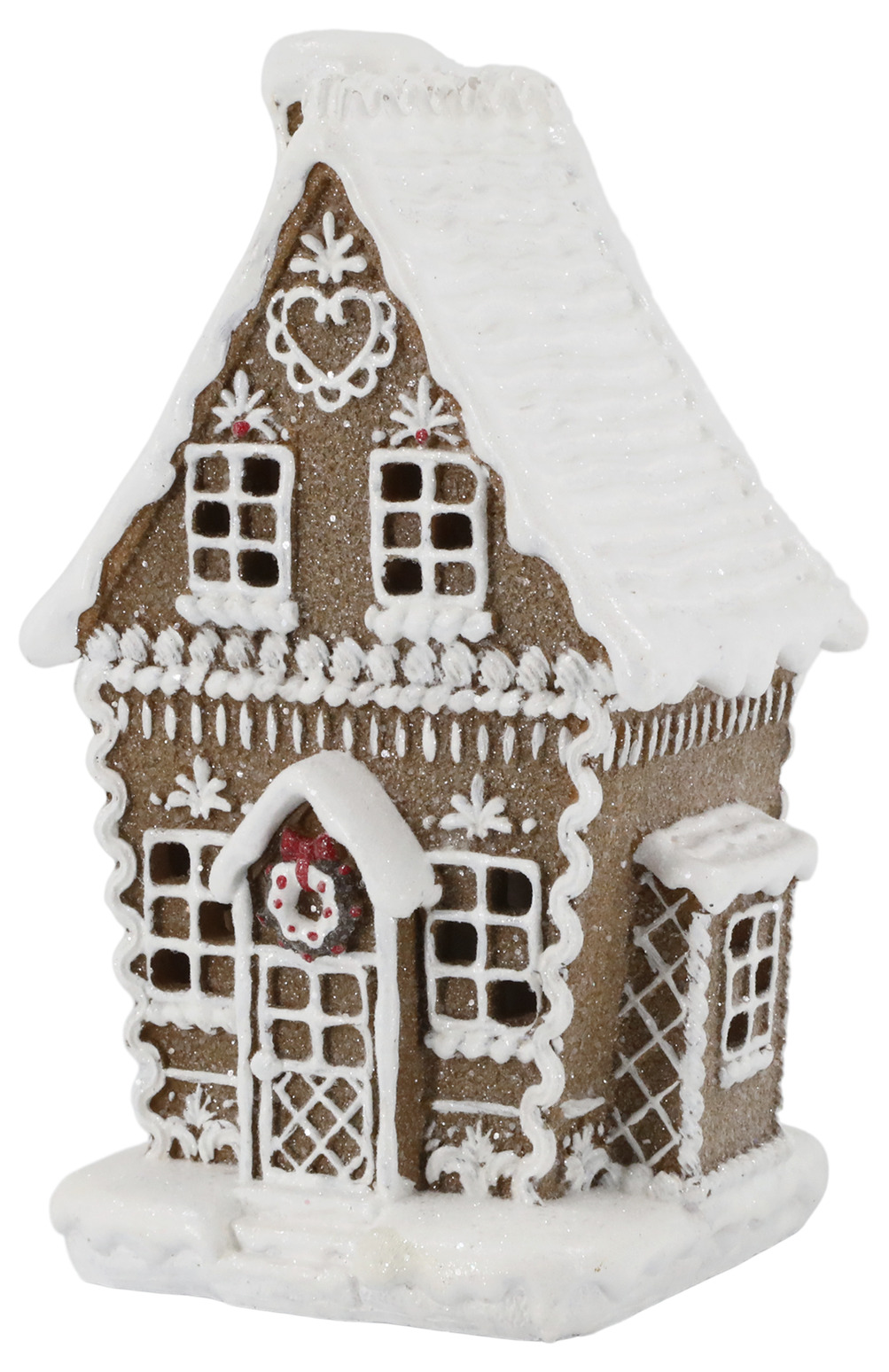 Ett charmigt pepparkakshus i klassisk design med vackra detaljer av snö och dekorativa fönster som sprider ett varmt ljus när det är tänt. Den höga, eleganta fasaden gör huset till en ståtlig detalj i juldekorationerna och det passar lika bra på en hylla som på ett sideboard eller i en julby.