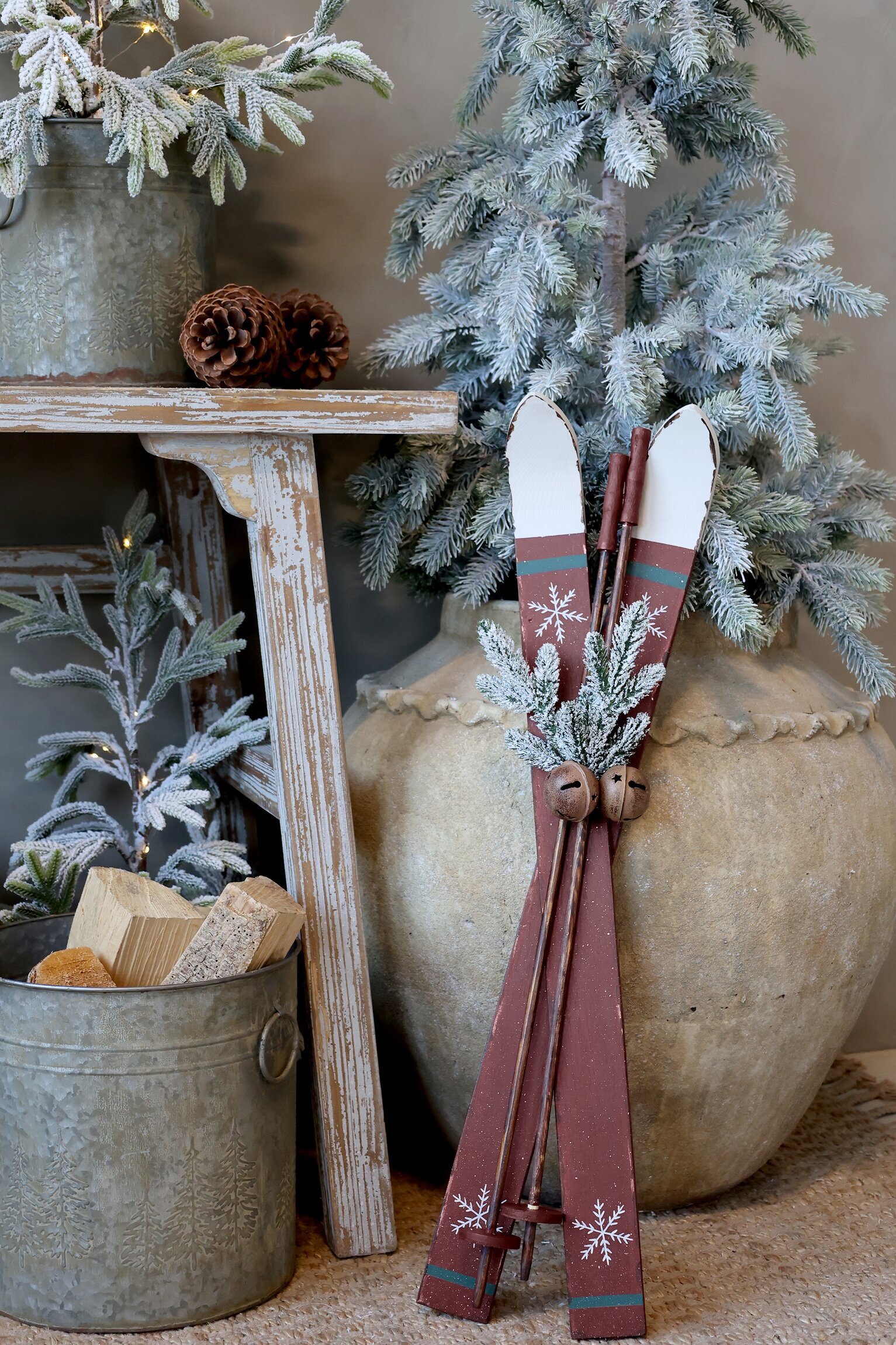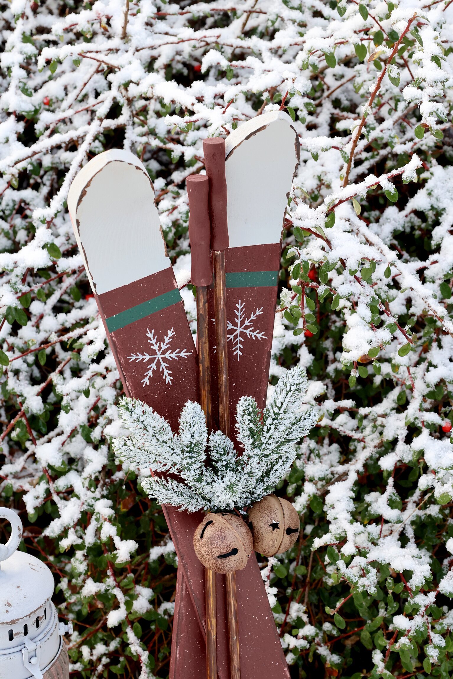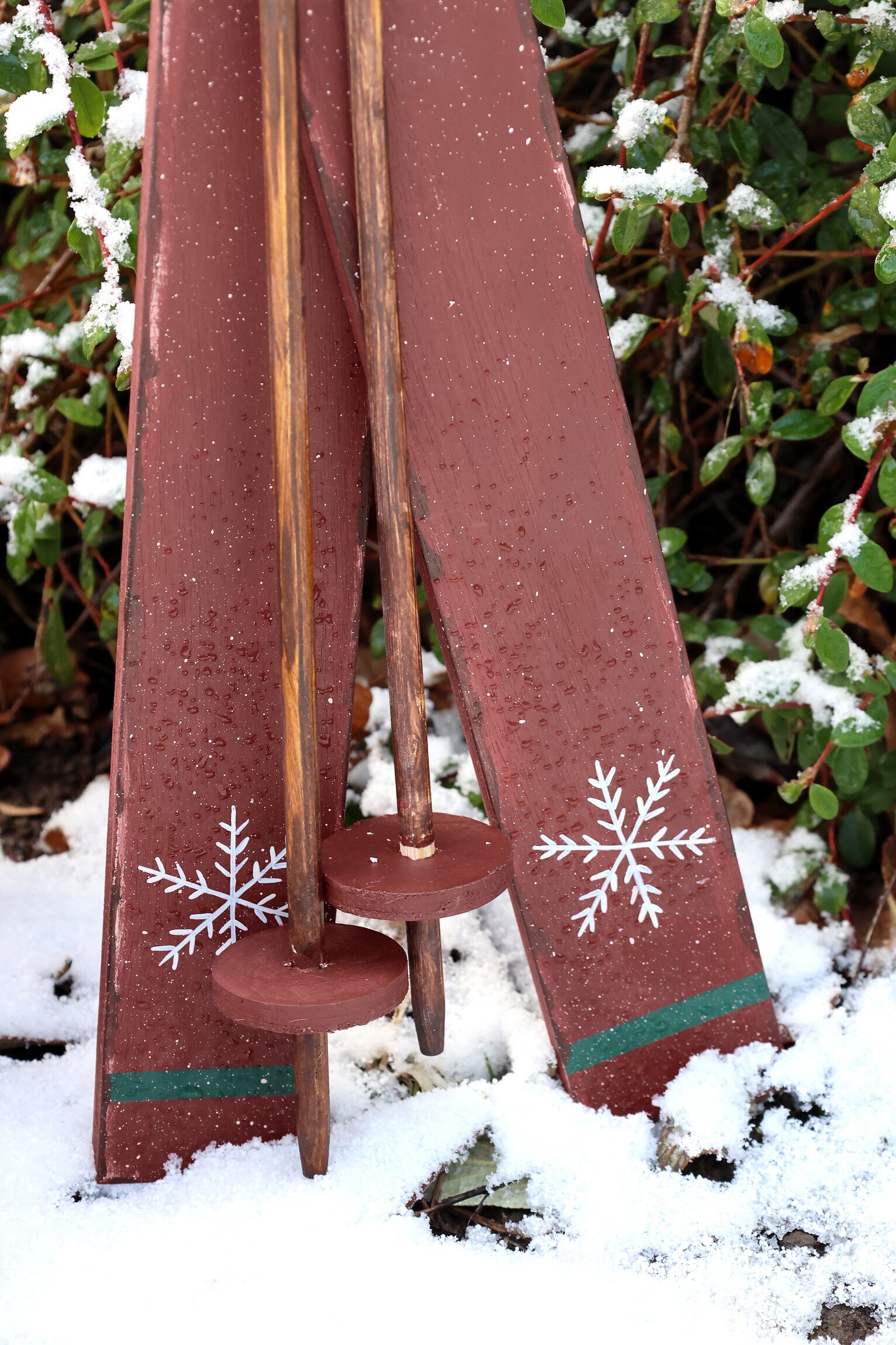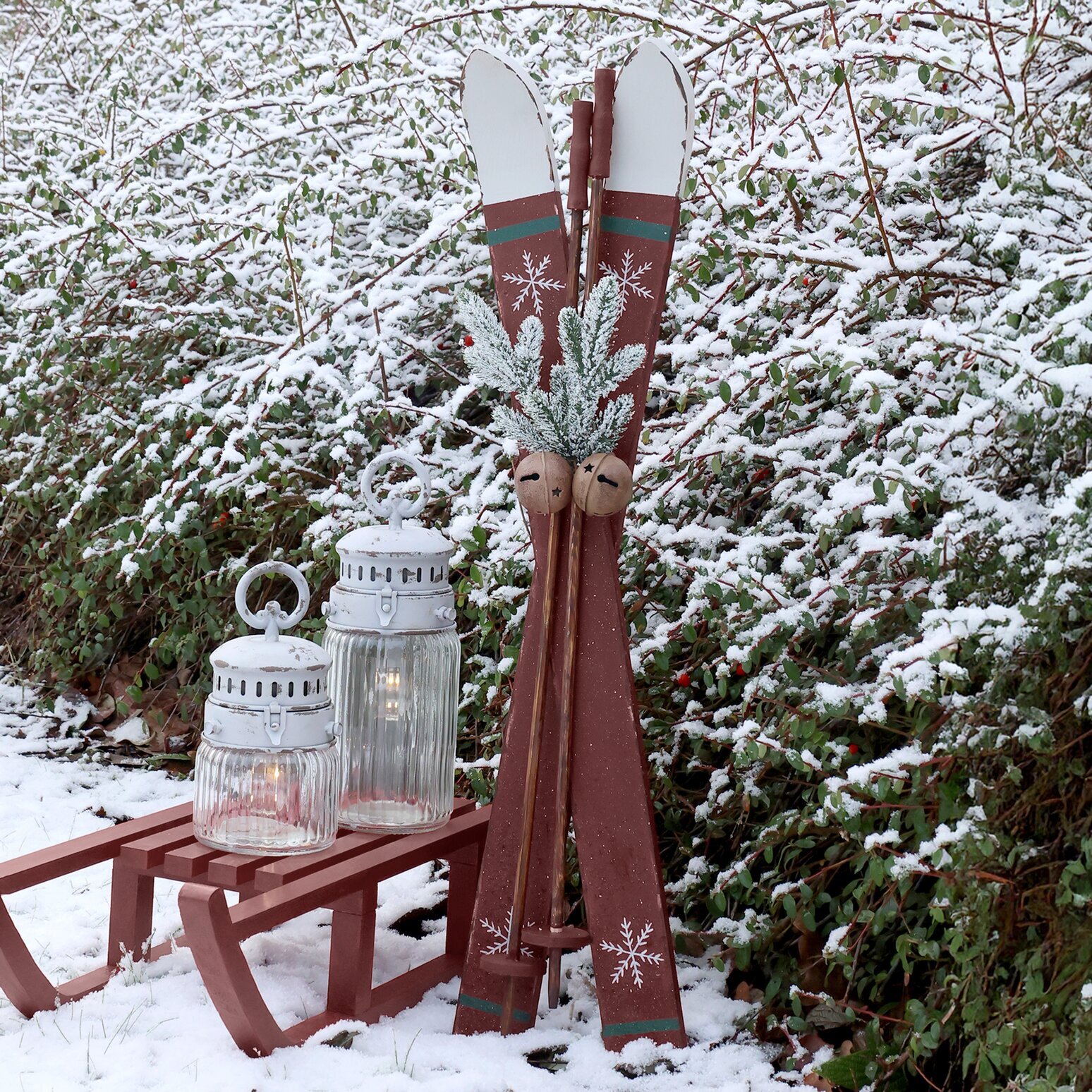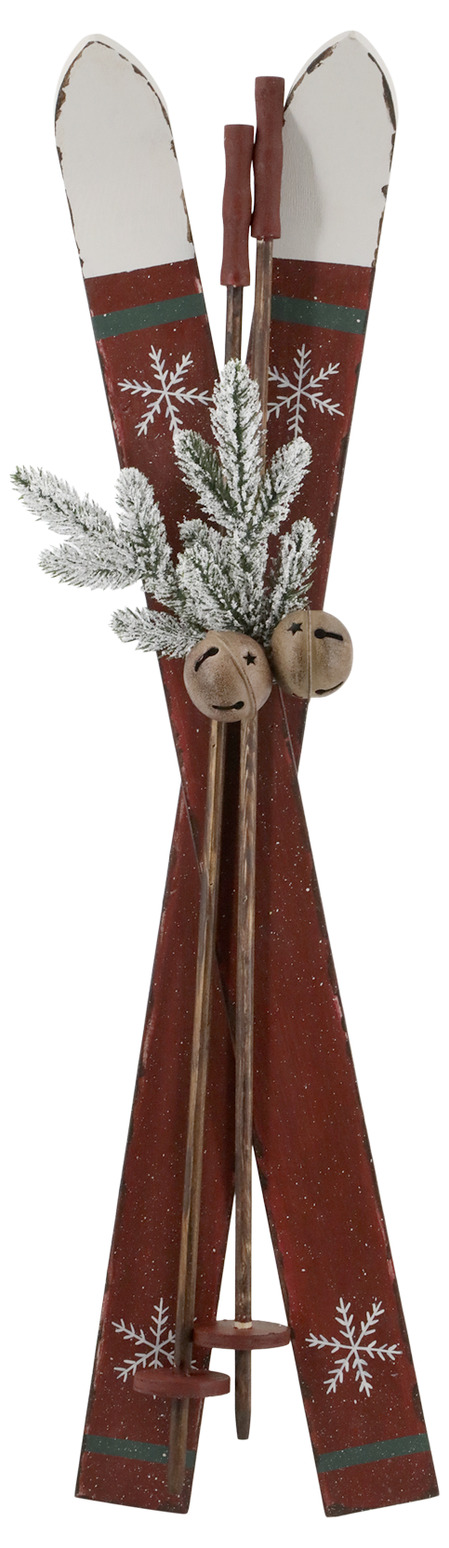 Rustika träskidor i klassisk julröd färg med handmålade snöflingor. Prydda med grönt granris och två bjällror blir de en stämningsfull dekoration. Perfekta att ställa vid granen, i hallen eller som en mysig detalj på verandan.