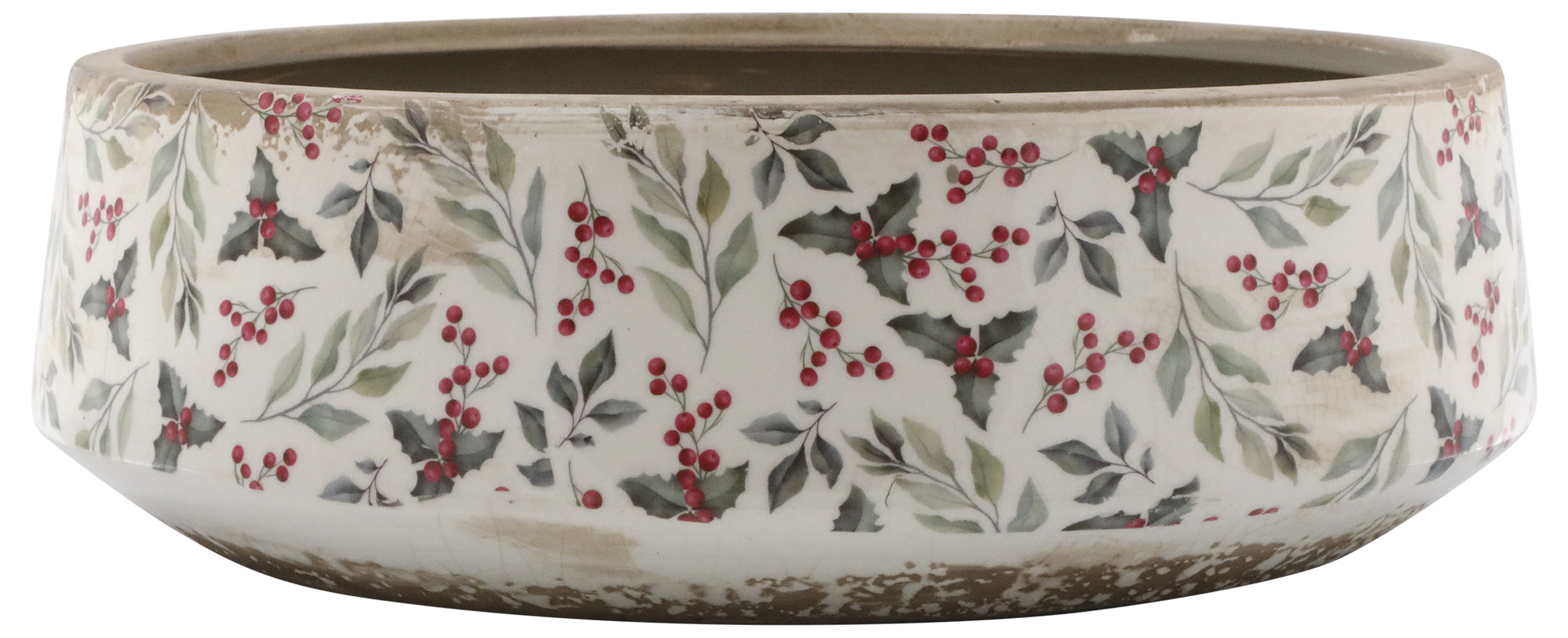 Stämningsfull skål i keramik med vackert mönster av vintergröna blad och röda bär. Perfekt som planteringsskål för hyacinter, amaryllis eller andra säsongsblommor. En charmig detalj som sprider julkänsla i hemmet.