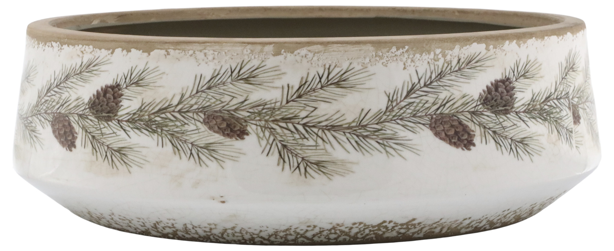 En vacker skål i keramik med naturinspirerat mönster av tallkvistar och kottar. Den rustika ytan i kombination med de handmålade detaljerna ger ett unikt och tidlöst uttryck som för tankarna till vinterns stilla skog.