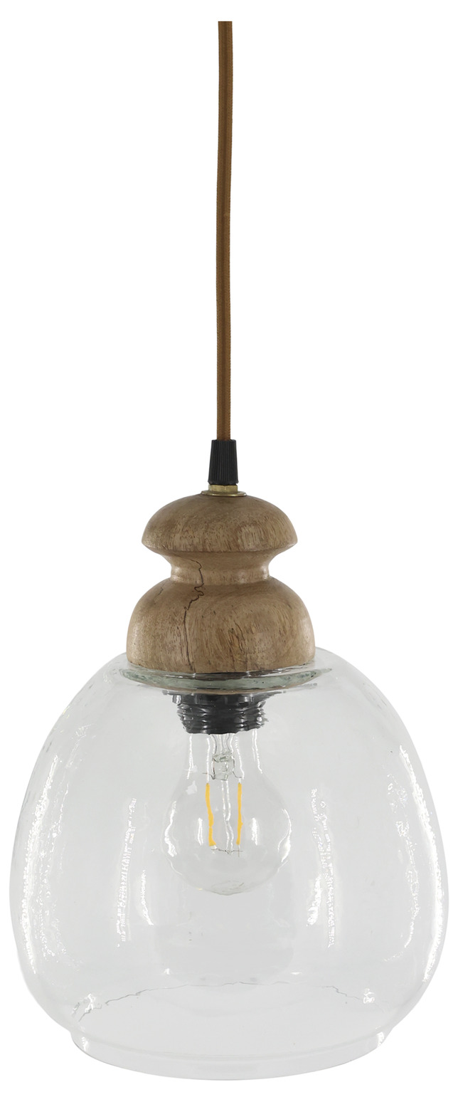 Ge ditt hem en varm och naturlig känsla med denna stilfulla takpendel i glas och mangoträ. Den klara glaskupan sprider ett mjukt sken, medan den vackra trädetaljen ger en rustik och charmig kontrast. Perfekt över matbordet, i vardagsrummet eller som en mysig detalj i hallen.