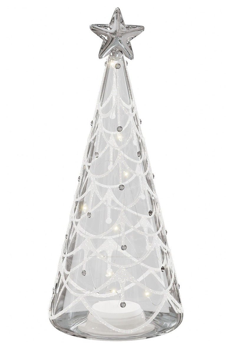 Skapa en magisk julstämning i ditt hem med denna vackra glasgran. Den är dekorerad med gnistrande detaljer och toppas av en stjärna som lyser upp med små, varmvita LED-ljus. Perfekt som blickfång i fönstret, på bordet eller i hyllan – en tidlös dekoration som sprider både ljus och julkänsla år efter år.