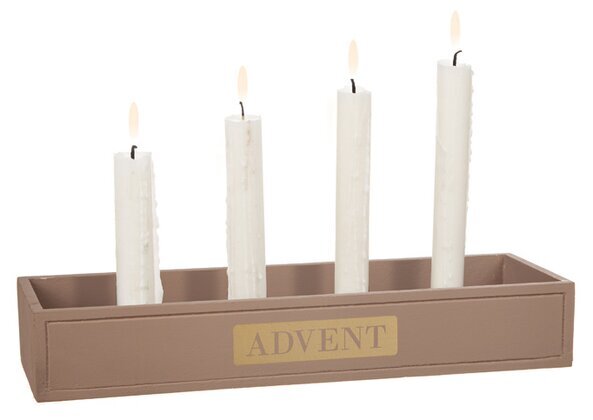 Skapa en varm och välkomnande julstämning med denna vackra adventsljusstake i en fin brun nyans. Den klassiska designen kombineras med en stilren text "Advent" på framsidan, vilket gör den både traditionell och dekorativ. Ljusstaken rymmer fyra kronljus och blir en naturlig samlingspunkt i hemmet under adventstiden.