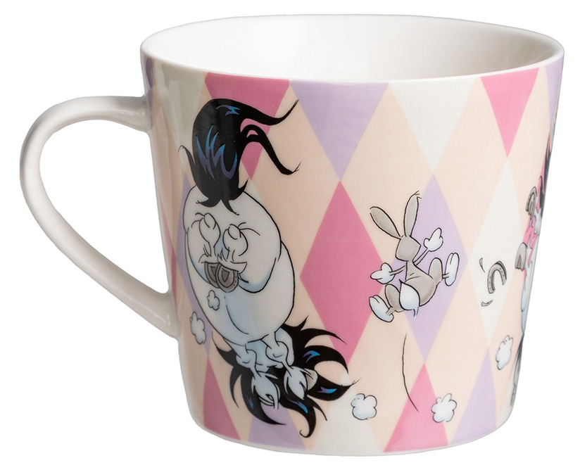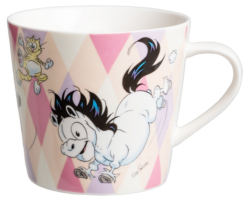 En färgglad porslinsmugg med lekfullt harlekinmönster och motiv av Hästen Mulle i sina klassiskt charmiga uttryck – full av energi, bus och humor. Läs mer
