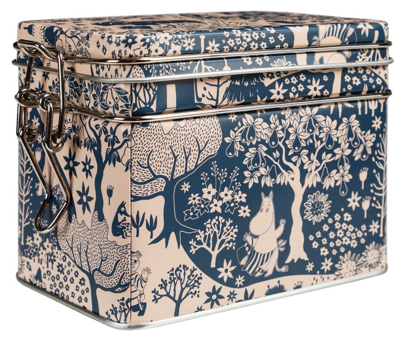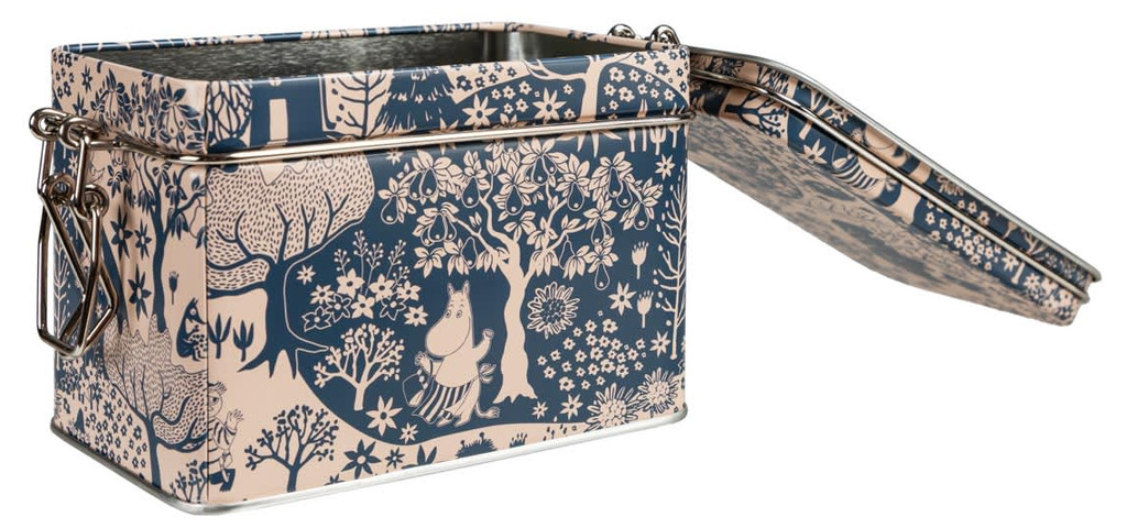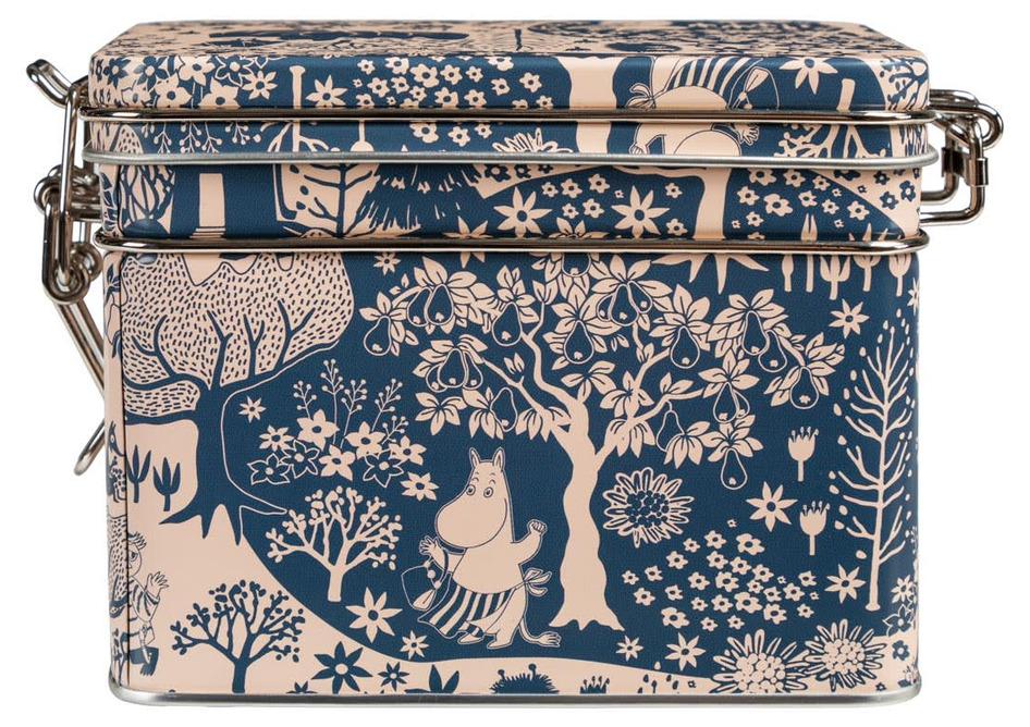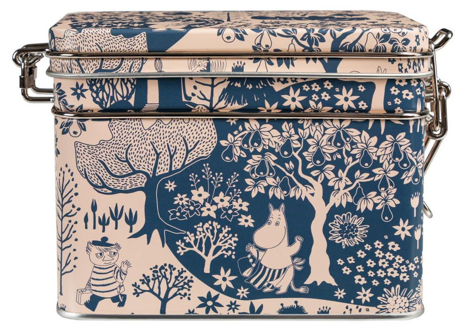 En premium-teburk med klassiskt Muminmotiv i mörkblått och beige/rosa. Den lufttäta burken har ett lock med spännlås som bevarar teets arom och fräschör länge.