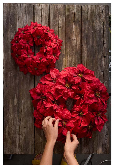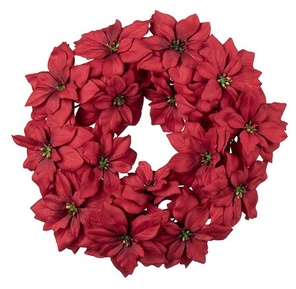 En vacker konstgjord krans fylld med röda julstjärnor som sprider julstämning. Perfekt att hänga på dörren, väggen eller som mittpunkt i en bordsdekoration. De naturtrogna blommorna håller sig lika fina år efter år – utan att vissna eller tappa färg. En tidlös julfavorit som skapar en varm och välkomnande känsla i hemmet.