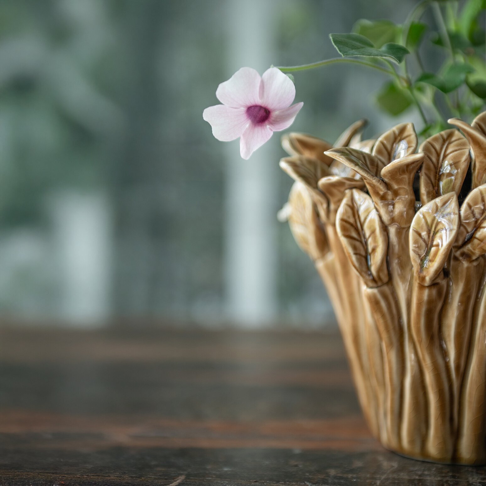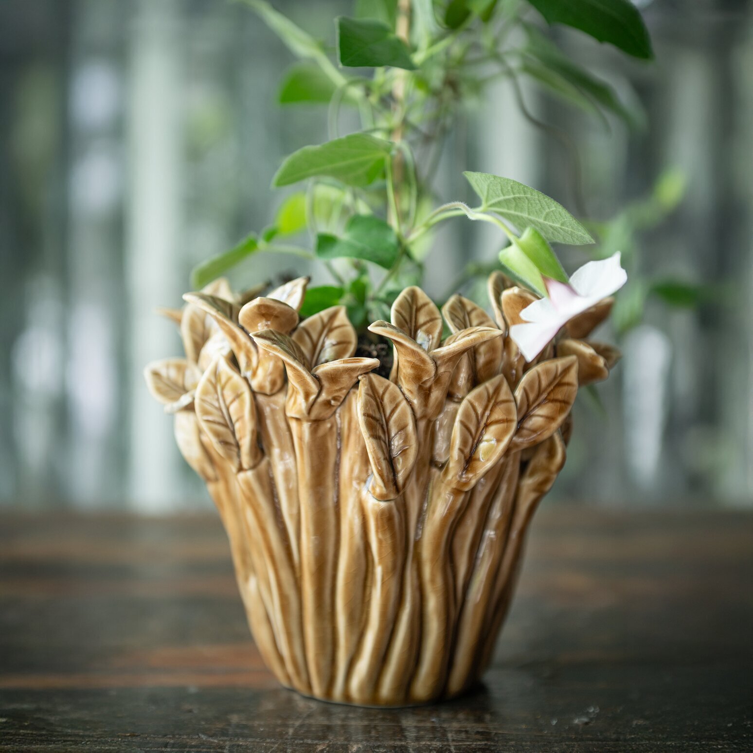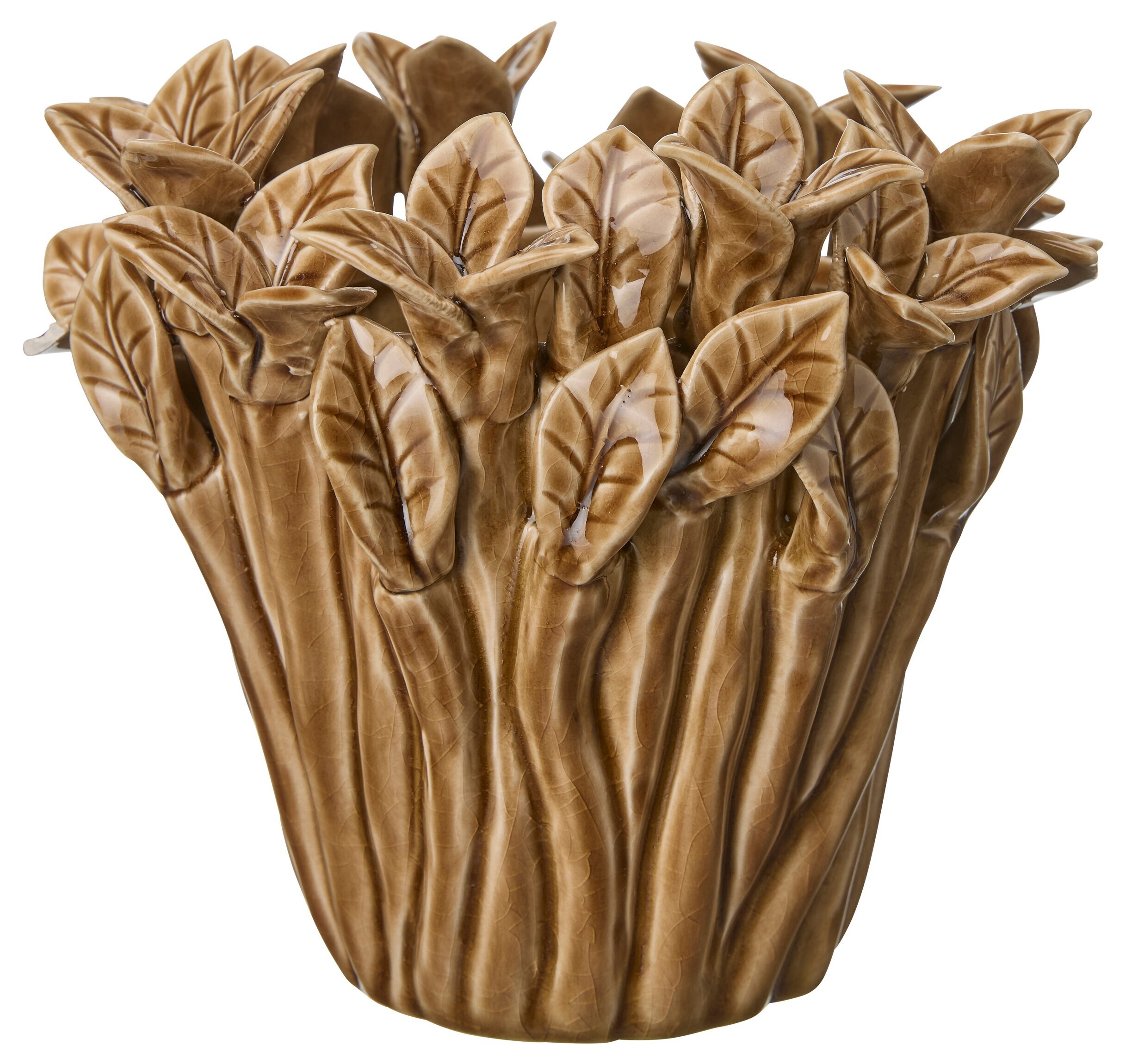 En unik och dekorativ kruka i stengods som blir ett riktigt blickfång i hemmet. Den brunmelerade ytan tillsammans med det vackra bladmönstret ger krukan en levande känsla som för tankarna till naturen. Perfekt för både gröna växter och färska blommor – eller som en fin inredningsdetalj i sig själv.